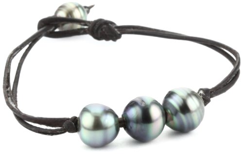 Pearls' take a modern approach with the Kala Three Tahitian Baroque Pearls on Double Leather Bracelet. Knotted along an urban brown leather chain are three 12 to 13mm Tahitian-cultured pearls that make a bold statement. The pearls contains magnificent luster which showcases their blue and purple hues created by their peacock color. Try wearing it alone or stacking it with other bracelets to create